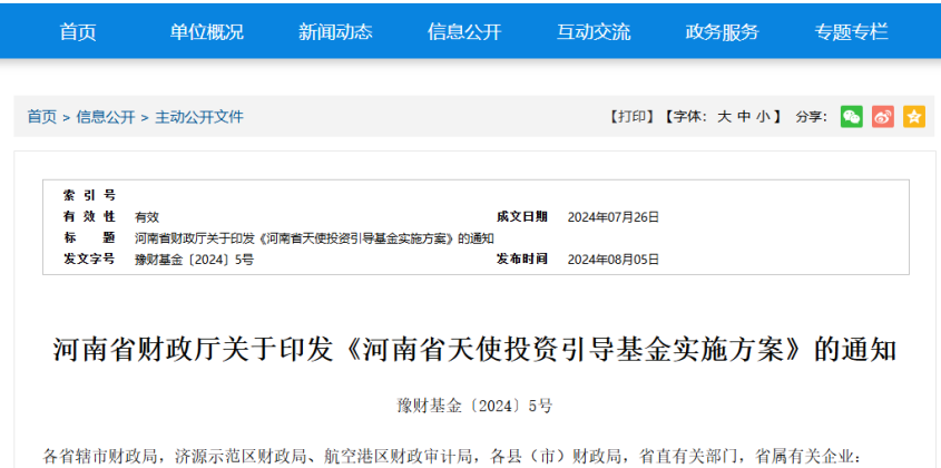 投资界(ID:pedaily2012)8月5日消息,河南省委2024年重点工作任务及科技 座谈会均明确要求:“设立省级天使投资母基金”...
