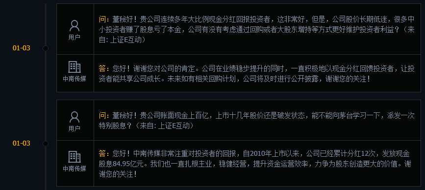 近期,有投资者在互动平台上提问:“公司连续多年大比例现金分红回报投资者,这非常好,但是公司股价长期低迷,很多中小投资者赚了股息亏了本金,公司有没有考虑通过回购或者大股东增持等方式更好维护投资者利益?”中南传媒回应称,“未来如有相关回购计划,公司将及时进行公开披露。”