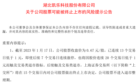 1月17日晚间,*ST凯乐称,截至1月17日,公司股票收盘价为0.67元/股,已连续13个交易日低于1元,即使后续7个交易日连续涨停,也将因股价连续20个交易日低于1元而触及交易类退市指标。后续触及交易类退市,上交所将在15个交易日内对公司股票做出终止上市决定,公司股票不进入退市整理期。