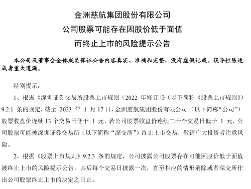 值得注意的是,1月17日晚间,深市也有一家公司就面值退市风险发布公告。*ST金洲(000587)称,截至1月17日,公司股票收盘价连续13个交易日低于1元,若公司股票收盘价连续20个交易日低于1元,公司股票可能被深交所终止上市交易。