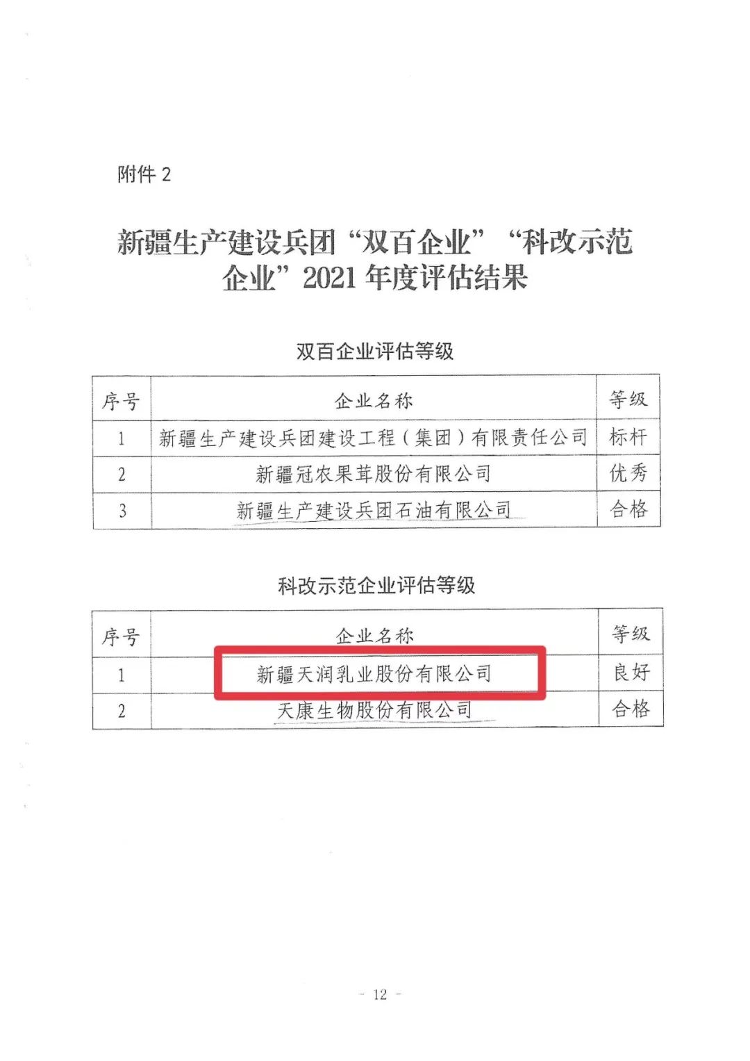 近日,兵团国资委转发国务院国有企业改革领导小组办公室对全国“双百企业”“科改示范企业”2021年度评估结果,新疆天润乳业(600419)股份有限公司(以下简称“天润乳业”)被评为良好“科改示范企业”。