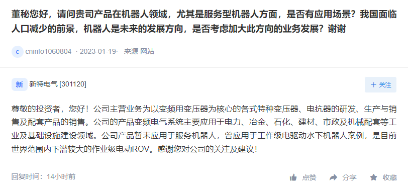 中国财富通1月29日-新特电气(301120)在互动平台上表示,公司主营业务为以变频用变压器为核心的各式特种变压器、电抗器的研发、生产与销售及配套产品的销售。公司的产品变频电气系统主要应用于电力、冶金、石化、建材、市政及机械配套等工业及基础设施建设领域。公司产品暂未应用于服务机器人,曾应用于工作级电驱动水下机器人案例,是目前世界范围内下潜较大的作业级电动ROV。