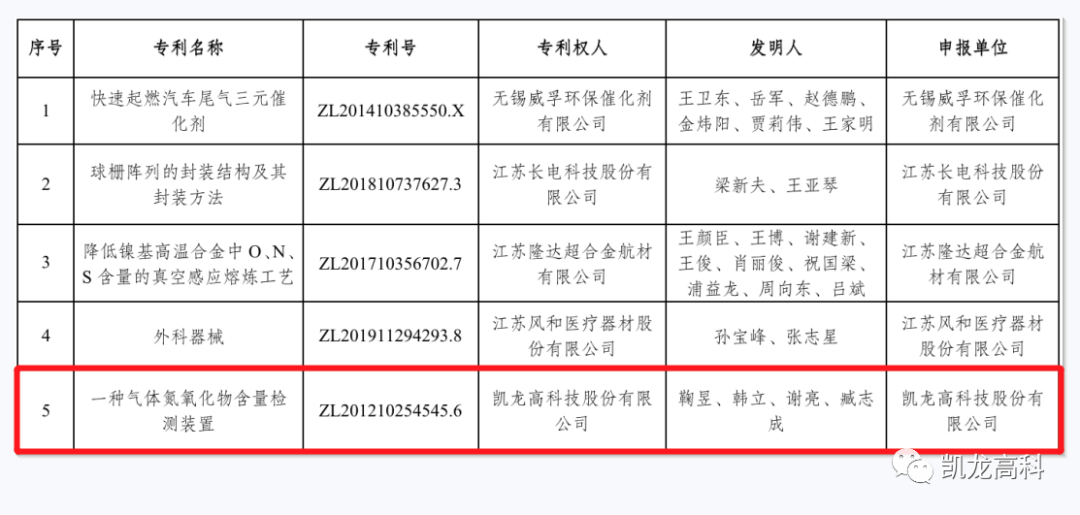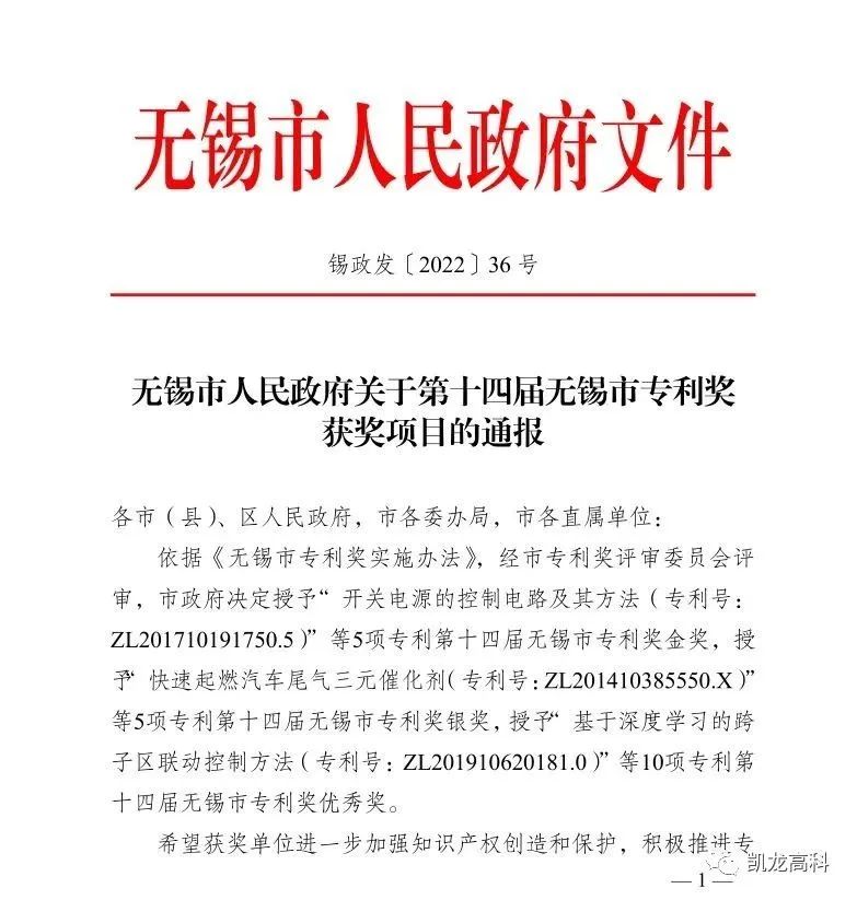 1月17日,无锡市人民政府发布了《关于第十四届无锡市专利奖获奖项目的通报》,授予5项专利为第十四届无锡市专利奖金奖,5项专利为专利奖银奖,10项专利为专利奖优秀奖。我市共8家上市公司获奖。银 奖凯龙高科(300912)技股份有限公司凭借“一