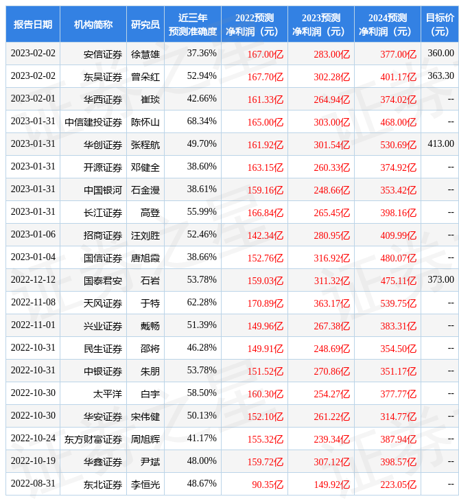 数据中心根据近三年发布的研报数据计算,中信建投(601066)证券陈怀山研究员团队对该股研究较为深入,近三年预测准确度均值为68.34%,其预测2022年度归属净利润为盈利165亿,根据现价换算的预测PE为52.03。