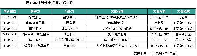 本月重点监测房企共涉及18笔并购交易,披露的交易对价约272亿,受春节假期影响年初收并购热度一般。本月市场关注度高的并购有2宗:其一山东国资宣布目前已介入奥园主导的珠海翠微村旧改(当前停工状态,货值超220亿),项目局部盘活带来增量资金外,自救意愿越高也越能改善市场主体对其信心;其二融创35.8亿出售深圳冰雪文旅城剩余股权予华发,但仍保留项目回购权,未来双方成立平台公司共同负责冰雪文旅城的操盘、销售和运营,继续发挥融创在冰雪项目的运营优势,释放更多资产价值。