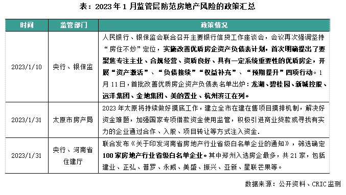 1月10日,央行、银保监会在主要银行信贷工作座谈会上首提“四项行动”,围绕“资产激活”、“负债接续”“权益补充”、“预期提升”四个维度引导优质房企改善资产负债表;次日,首批改善优质房企资产负债表名单出炉。“资产激活”重在“保交楼”,鼓励市场主体或地方政府或通过并购贷款和纾困基金等方式注入增量资金来激活项目;“负债接续”即推动存量融资的合理展期,“权益补充”聚焦“第三支箭”,改善优质房企资本结构。而“预期提升”在多重政策落地后优质头部房企风险或明显改善,届时市场主体对房地产信心或修复。