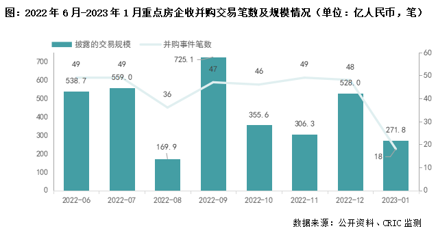 根据CRIC监测,2023年1月重点监测房企共涉及18笔并购交易,披露交易金额的有14笔,总交易对价约272亿人民币,环比大幅减少48.5%,披露的平均单笔并购交易规模19.4亿(2022年12月:16.5亿),受春节假期影响年初收并购热度一般。