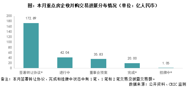 从交易进展来看,本月有8笔交易签署转让协议,披露交易额的7笔交易涉及价款173亿,其中华润集团联合华润置地108亿港元认购香港九龙长沙湾商住项目股权(住宅用途建面13.76万平、商业用途0.92万平)。此外,进行中、董事会预案、完成和挂牌中的交易笔数分别2笔、2笔、2和4笔,披露的交易金额分别42亿、36亿、20亿和1.05亿,其中珠江股份(600684)披露重大重组方案,拟28亿置出所持有房地产业务,再以7.79亿置入珠江城服100%股权(物管及文体业务),估值差额20亿由股东珠实集团现金补足,以此完成业务转型。
