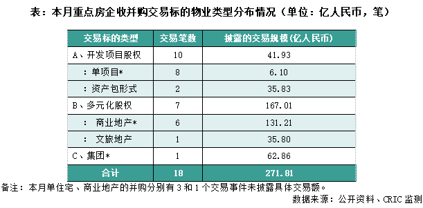 从交易标的物业类型来看,本月多元化、集团维度并购贡献占比较前期提升明显。7笔交易涉及多元化投资,对应交易额167亿,占到全部规模的61%,受华润置地、华润集团超百亿港元收购九龙长沙湾商住项目影响。而集团层面,本月厦门国资建发股份(600153)入主红星美凯龙(601828),以现金收购美凯龙29.95%的股份,交易对价约63亿,期待双方在供应链上的协同效应。