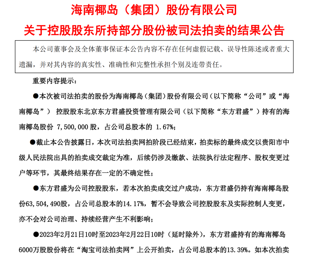 根据阿里司法拍卖平台显示,贵阳市中级人民法院于2月7日10时至2月8日10时在“阿里司法拍卖网”上公开拍卖东方君盛持有的海南椰岛750万股股票。