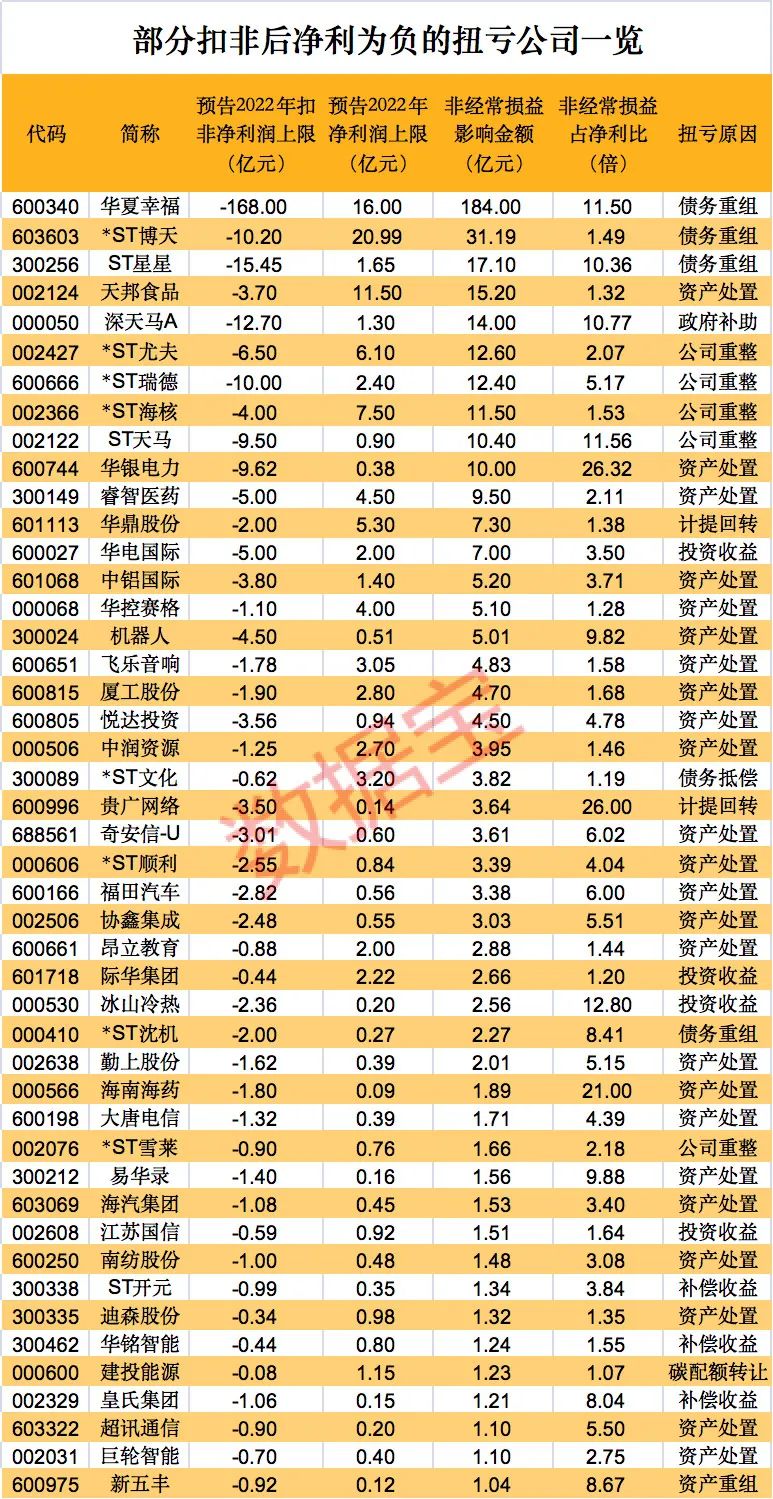 上述扭亏公司,业绩是否真的“扭亏”?以扣非净利润看,其中有70家公司扣非后净利上限仍为负值,也就是说,这些公司扭亏是靠卖资产、政府补助、投资收益、资产重组等等非经常损益项实现的。