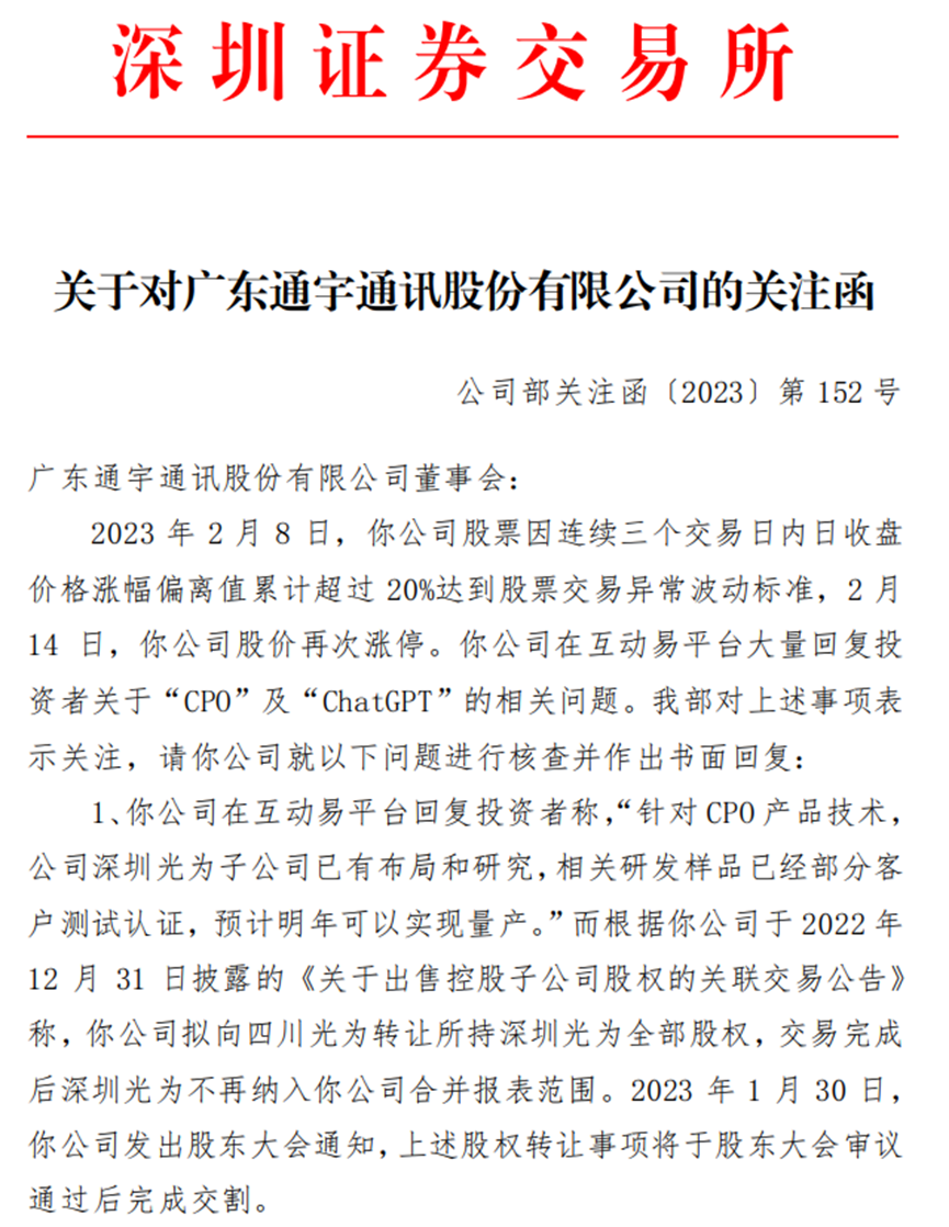 关注函提到,2022年12月30日晚,通宇通讯披露出售控股子公司股权的公告称,公司拟向四川光为转让所持深圳光为全部股权,交易完成后深圳光为不再纳入公司合并报表范围。对此,深交所要求通宇通讯说明,是否存在为配合市场炒作故意避重就轻、“蹭热点”的行为。