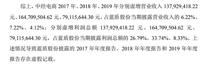 2022年8月,广东证监局下发的行政处罚决定书显示,*ST蓝盾(原蓝盾股份)子公司中经汇通电子商务有限公司(以下简称中经电商)2017至2019年分别虚增利润总额1.38亿元、1.65亿元和7911.6万元,占*ST蓝盾当期披露利润总额的26.79%、33.74%、8.33%。上述情况导致*ST蓝盾披露的2017年年度报告、2018年年度报告和2019年年度报告存在虚假记载。