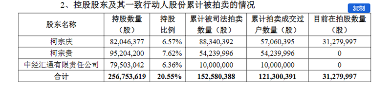 另外,柯宗庆持有的公司约3128万股股份将被司法拍卖。