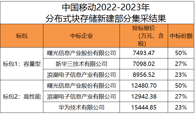 从中国移动(600941)官网获悉,中国移动日前公示了2022年至2023年分布式块存储新建部分的集采结果,中科曙光(603019)、新华三、浪潮信息(000977)和华为四家中标。从本次分布式块存储产品集采的中标情况看,本次中科曙光包揽了