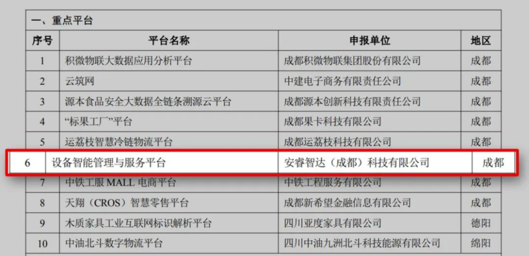 日前,四川省经济和信息化厅对外发布了《关于四川省新经济重点平台和新场景名单(第一批)的公示》。由安睿智达(成都)科技有限公司自主研发的“设备智能管理与服务”平台,获选为10个四川省首批新经济重点平台之一。