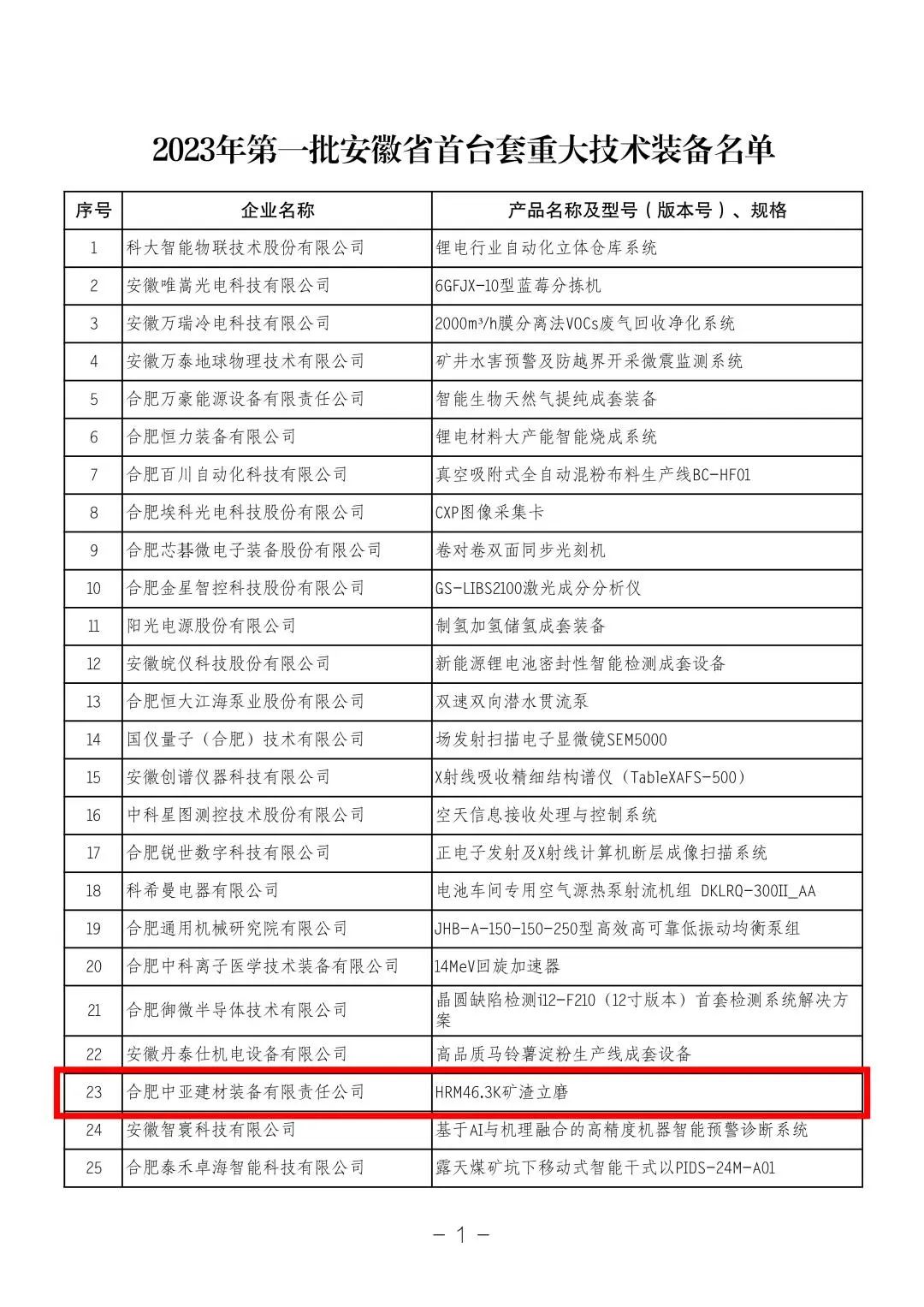 合肥院中亚装备公司产品入选2023年第一批安徽省首台套重大技术装备名单