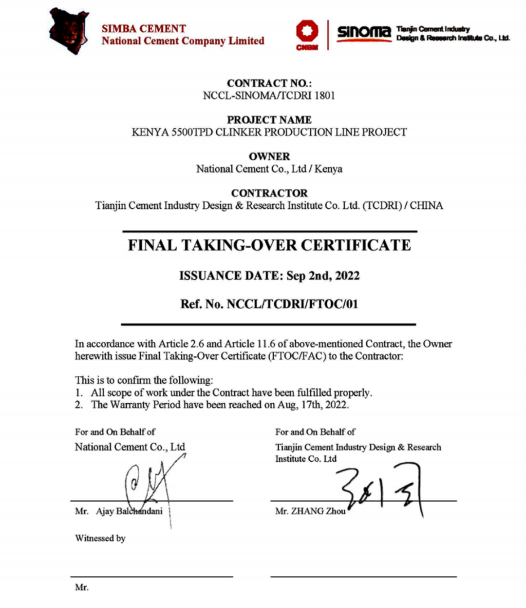 近日,由天津水泥院总承包的肯尼亚NCCL日产5500吨熟料线项目以及粉磨站项目收到了业主签发的FAC证书,标志着项目合同履约圆满完成。该项目获得了2022年度建材行业优秀工程设计奖一等奖。