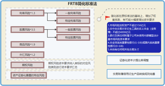征求意见稿提出对于资产规模或者交易账簿规模较小的银行,在满足一定前提下,可经监管批准后使用简化的FRTB标准法。简化标准法计量基本沿袭旧的管理办法的计量思路并进行简单调整。