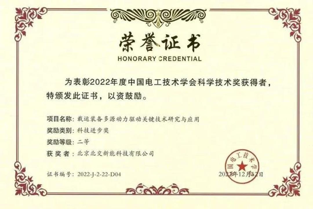 2022年底,中国电工技术学会“2022年科技进步奖评选”公布,北交新能“运载装备多源动力驱动关键技术研究与应用”项目荣获中国电工技术学会科技进步二等奖。
