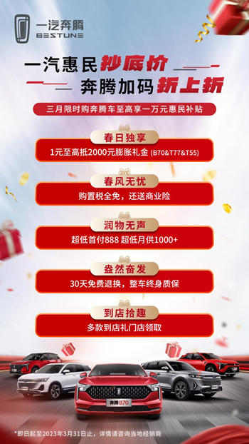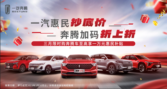 购车折上折,终身售后不用愁。无论对于新车首购还是升级换购,一汽奔腾都为用户带来了“等一等会后悔,先下手更实惠”的购车时机。必须再次提醒的是,此次中国一汽亿元限时惠民补贴活动仅限吉林省内用户3月份购车,时机难得,抄底要趁早!