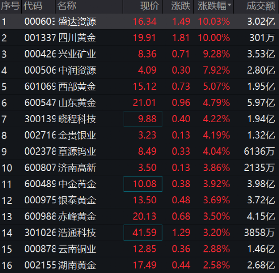 港股市场上,黄金股领涨原材料业,中国黄金(600916)国际涨近7%,招金矿业涨超5%。
