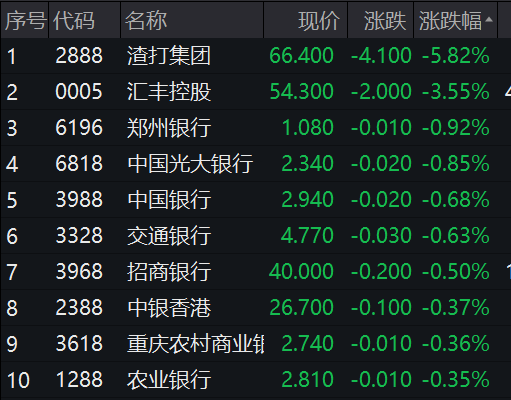 受美国银行倒闭影响,香港银行股开盘大跌:渣打银行跌近6%,汇丰控股跌超3.5%。