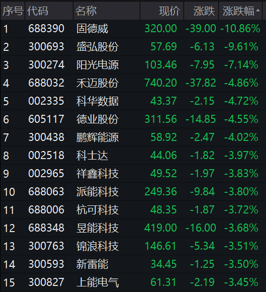 3月14日上午,光伏、储能概念集体下行,盛弘股份(300693)大跳水,盘中一度跌近10%。固德威跌超10%,市值跌下400亿元。阳光电源(300274)跌超7%,禾迈股份、科华数据(002335)等热门股,跌幅均排在前列。