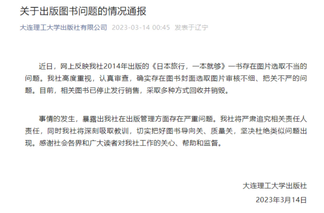 近日,网上反映我社2014年出版的《日本旅行,一本就够》一书存在图片选取不当的问题。我社高度重视,认真审查,确实存在图书封面选取图片审核不细、把关不严的问题。目前,相关图书已停止发行销售,采取多种方式回收并销毁。