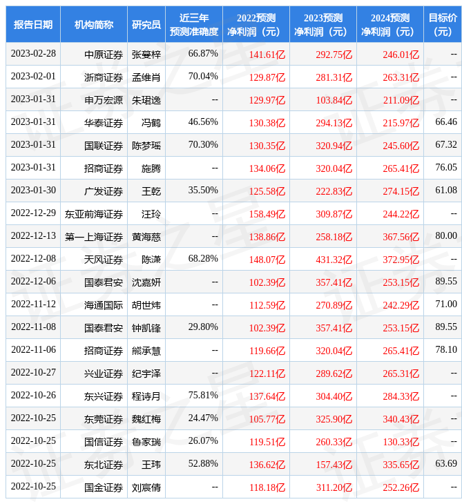 数据中心根据近三年发布的研报数据计算,东兴证券程诗月研究员团队对该股研究较为深入,近三年预测准确度均值为75.81%,其预测2022年度归属净利润为盈利137.64亿,根据现价换算的预测PE为19.46。