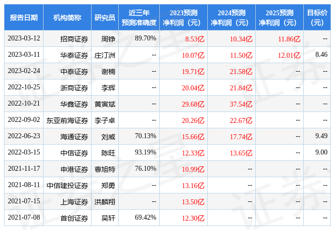 数据中心根据近三年发布的研报数据计算,中信证券陈旺研究员团队对该股研究较为深入,近三年预测准确度均值高达93.19%,其预测2023年度归属净利润为盈利12.33亿,根据现价换算的预测PE为10.17。