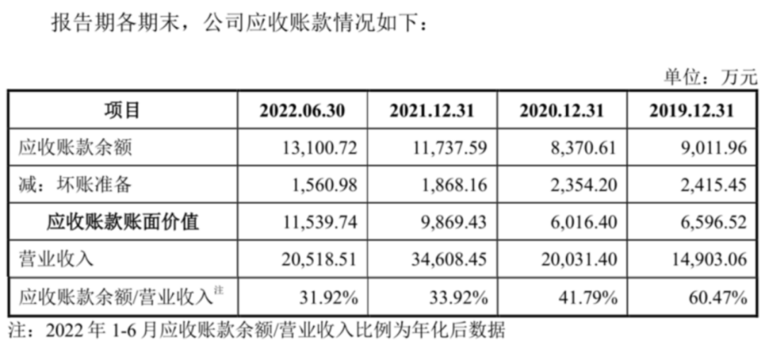 2019-2021年及2022上半年,公司应收账款账余额分别为9011.96万元、8370.61万元、1.17亿元和1.31亿元,占当期营业收入的比例分别为60.47%、41.79%、33.92%、31.92%;其中坏账准备分别为2415.45万元、2354.2万元、1868.16万元和1560.98万元,相比于各期净利润831.84万元、2137.62万元、5081.59万元和2108.01万元而言,占据着极大的比例。