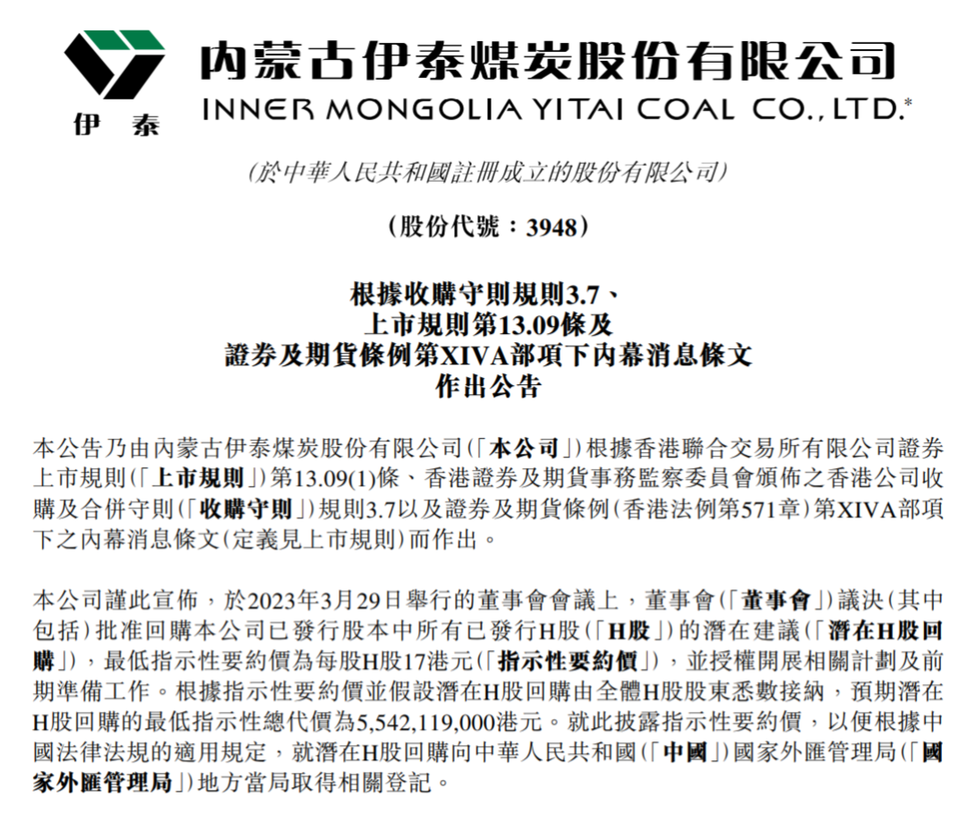 伊泰煤炭发布公告,于2023年3月29日举行的董事会会议上,董事会议决批准回购公司已发行股本中所有已发行H股的潜在建议(潜在H股回购),最低指示性要约价为每股H股17港元(指示性要约价),并授权开展相关计划及前期准备工作。根据指示性要约价并假设潜在H股回购由全体H股股东悉数接纳,预期潜在H股回购的最低指示性总代价为55.42亿港元。就此披露指示性要约价,以便根据中国法律法规的适用规定,就潜在H股回购向中国国家外汇管理局地方当局取得相关登记。