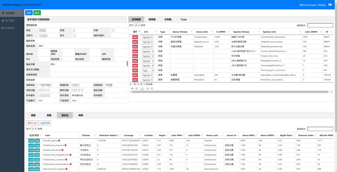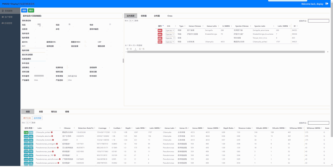 PM Display智能报告系统是配套PMseq 病原微生物高通量测序产品的组学大数据分析系统,实现对PMseq 病原检测后的检测结果归集、存储、统计、分析、数据挖掘。使用可视化操作界面,人工确定检出病原为最终临床报告。该系统带自我学习功能,在使用过程中不断结合用户给出的结果优化默认推荐病原,并能结合PM Online给出不同病原的检出分布。