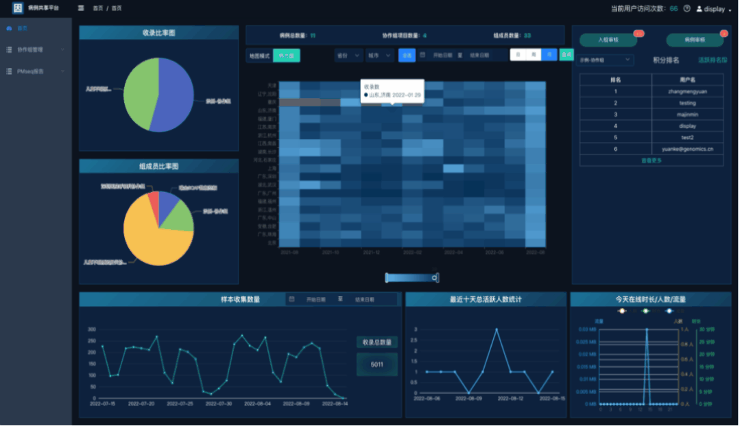 PM Online线上数据管理系统集成了PMseq 自动化病原分析数据平台,使得病原鉴定组学数据在中心本地化集中存储,实现用户在线授权访问,可以协助医院实现病原组学检测数据管理、病原统计、检出频率、病原谱和时空分布等统计分析功能;并且支持数据共享合作,临床和基因组学科学研究,可为医院及疾控等机构的大数据分析与再挖掘提供强有力的技术平台支撑。