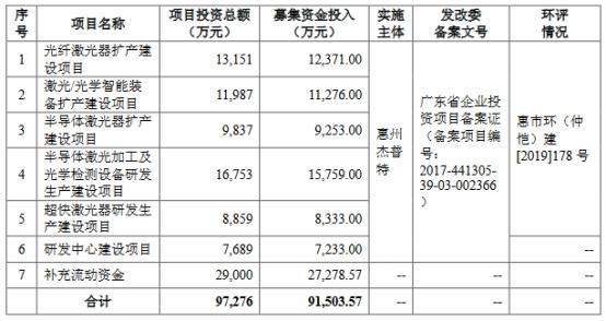 杰普特此次募集资金总额为10.13亿元,扣除发行费用后募集资金净额为9.15亿元,分别用于光纤激光器扩产建设项目、激光/光学智能装备扩产建设项目、半导体激光器扩产建设项目、半导体激光加工及光学检测设备研发生产建设项目、超快激光器研发生产建设项目、研发中心建设项目、补充流动资金。