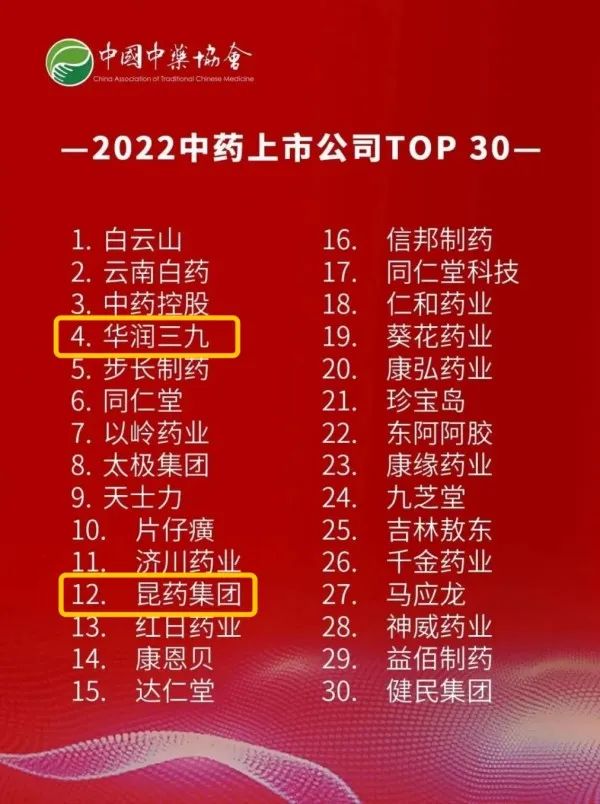 近日,由中国中药协会主办的“第三届中国中药品牌建设大会”在北京召开,华润三九(000999)和昆药集团(600422)均荣列“2022中药上市公司TOP30”榜单。