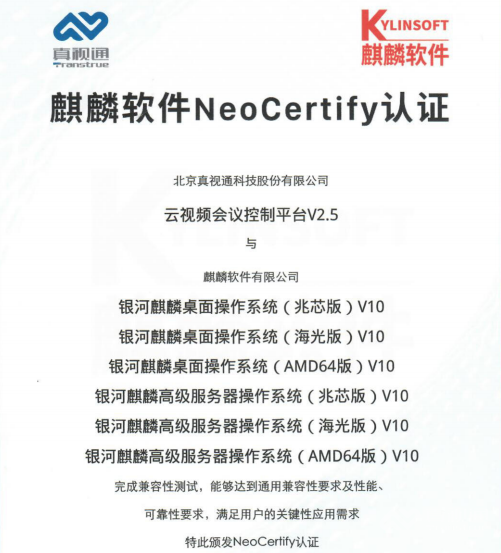 真视通云视频会议平台相关认证