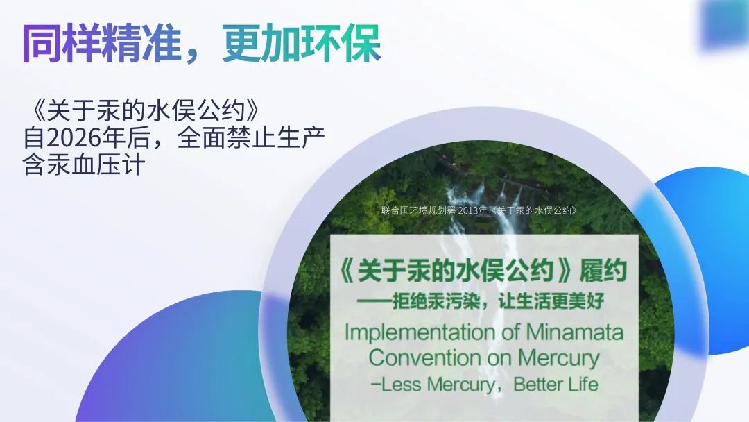 此外,由于水银泄漏的危害性极大,根据《水俣公约》,自2026年1月1日期,我国将全面禁止生产含汞体温计和含汞血压计产品,未来我们将彻底告别含汞血压计产品。汉王电子血压计的上市,替代了当前的柯氏音水银血压计,让日常的血压测量轻松准确的同时又能保护环境,让生活更加美好。