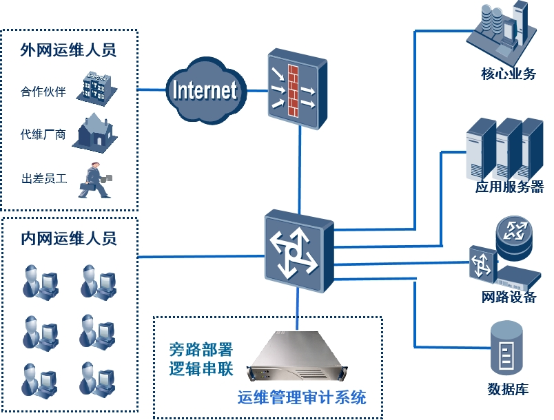 结合ITIL、ITSM、IT 内控、SOX法案COBIT 法规、信息安全等级保护、密评合规性及IT运维管理要求,专注于网络信息安全领域的吉大正元,综合多年IT运维管理建设经验和业界信息安全建设的基础上,在不更改原有网络拓扑结构、不影响服务器的业务数据流、不需要在被保护服务器和终端上安装任何Agent的情况下,满足用户对企业“人机”交互、企业“应用”交付的集中管理、集中认证、集中控制、集中审计等一系列安全需求。