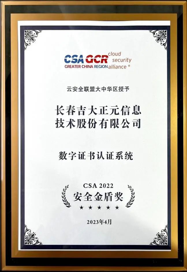 会上,吉大正元(003029)(003029)“数字证书认证系统”成功获评“CSA 2022安全金盾奖”,该奖项旨在表彰安全产品或安全服务具备核心竞争力,能够解决当前行业领域亟需解决的主要问题,在相关领域占据重要的市场份额,且具备一定创新性,并得到业界认可,是相关安全领域的佼佼者。
