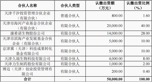依据公告,康希诺此次参与设立的基金名称为“元希海河(天津)生物医药产业基金合伙企业(有限合伙)”(简称“元希海河基金”),成立于2023年4月20日,基金规模5亿元,共有8名投资人(如下图)。
