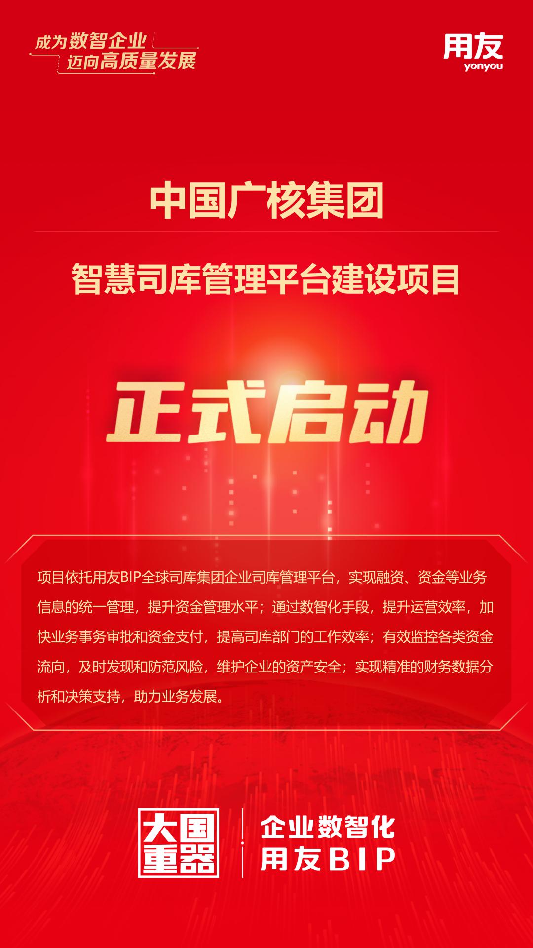 近日,由用友承建的中国广核(003816)集团(简称:中广核)智慧司库管理平台建设项目启动会在双方领导的见证下隆重召开。中广核财务资产部总经理、财务公司董事长罗军,中广核财务公司总会计师陈德邵等客户方领导,用友网络(600588)高端BG总裁何强,用友网络副总裁李建敏,用友网络助理总裁尹纪海等用友方领导及双方项目组成员出席本次会议。