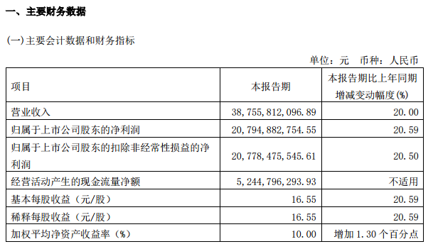 4月25日晚,贵州茅台(600519)发布2023年一季报,公司首季营收387.56亿元,同比增长20%;归属上市公司股东净利207.95亿元,同比增长20.59%。
