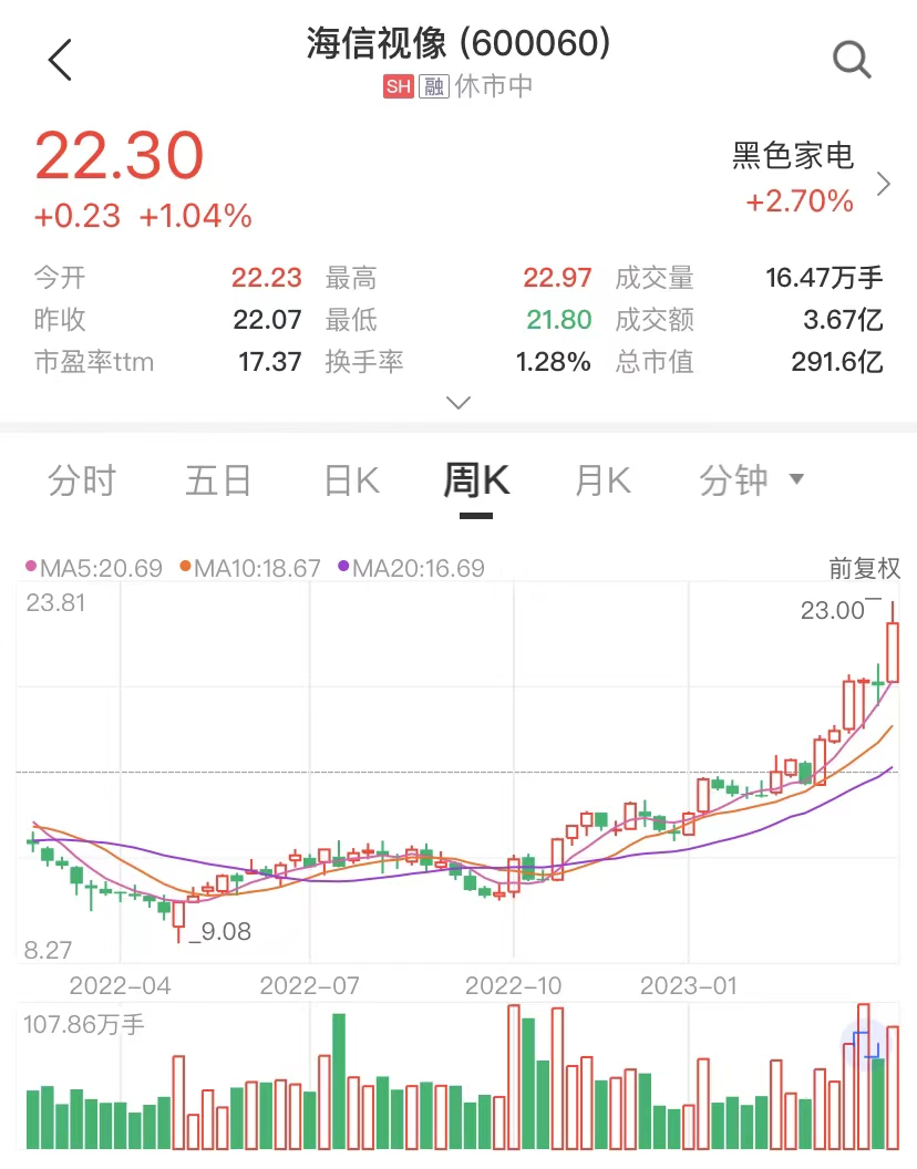 股价方面,海信视像自去年4月27日创出阶段性低点9.05元以来,截至今年4月28日收盘,股价报22.3元/股,一年来涨幅高达146%。业内人士分析,海信视像亮眼业绩的背后,得益于公司全场景显示战略的布局升级,特别是高端化、全球化的加速推进。
