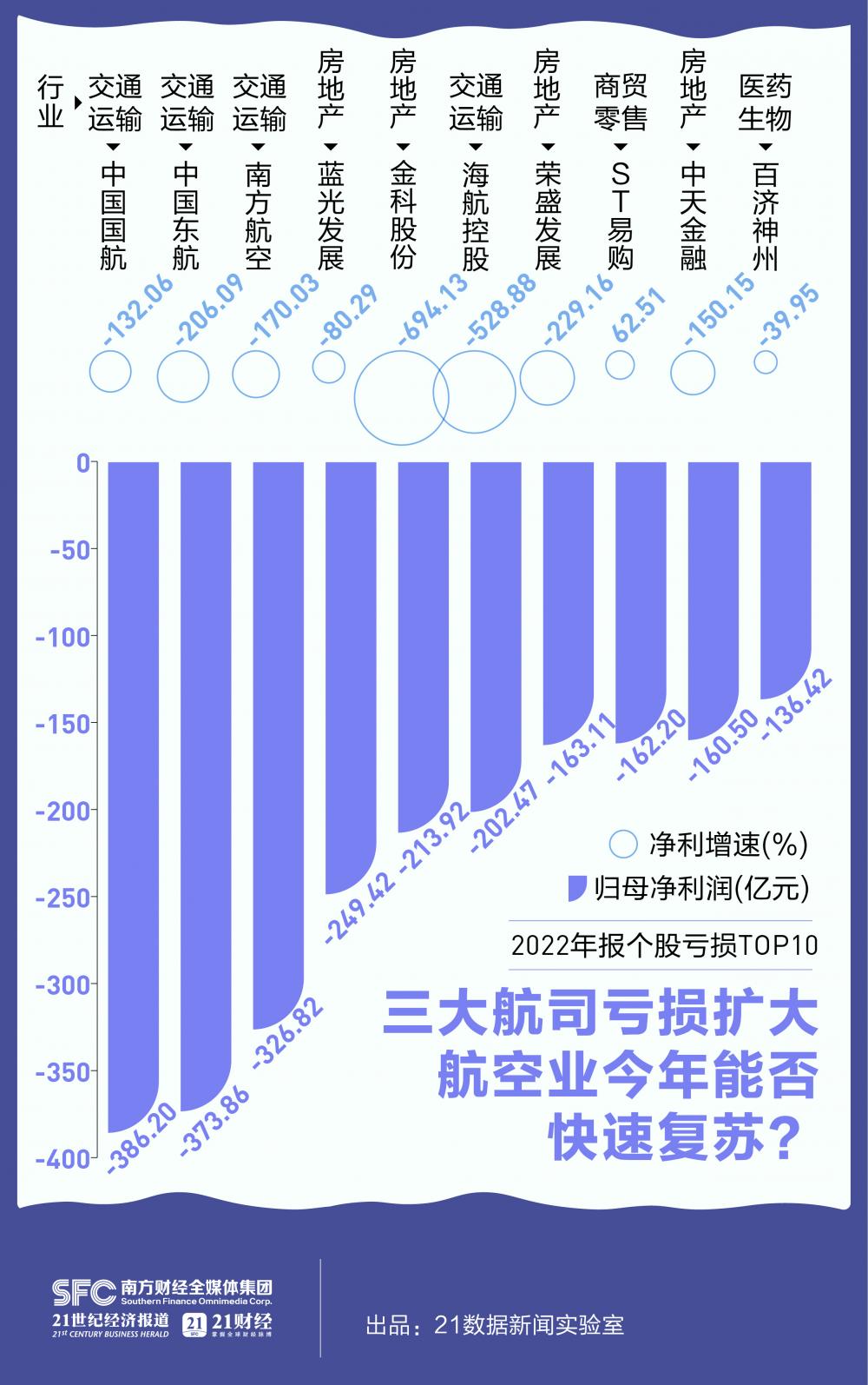 在个股亏损TOP10中,有5家公司来自航空业。作为国内航空业代表的“三大航司”,中国国航(601111)、中国东航(600115)、南方航空(600029)2022年亏损额继续扩大,均超过300亿元,刷新最高亏损记录。此外,海航控股(600221)由盈转亏,净利同比下滑529%,录得202亿元净亏损。