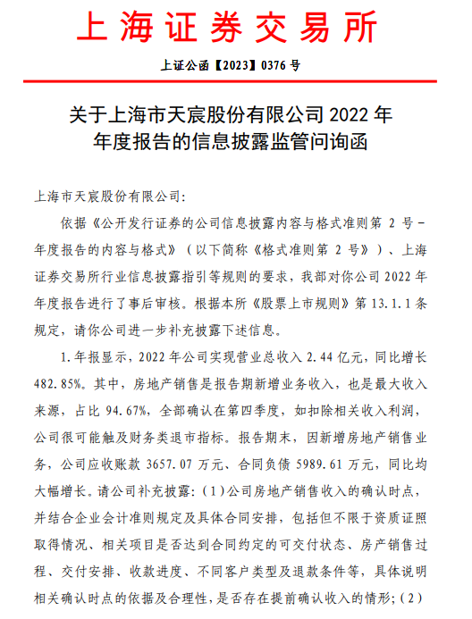 在年报披露后,天宸股份收到了上交所下发的问询函。上交所要求其补充说明公司房地产销售收入的确认时点,并结合企业会计准则规定及具体合同安排,具体说明相关确认时点的依据及合理性,是否存在提前确认收入的情形;主要房地产客户资金来源,核实相关资金轨迹是否涉及公司及潜在关联方,是否存在关联交易非关联化、收入确认不具备商业实质的情形;应收账款前五名客户情况、是否涉及关联方或利益相关方,并结合具体业务模式,包括但不限于建造、销售、收款流程等,说明相关应收账款及合同负债的性质,是否符合一般房地产销售惯例;公司房地产销售业务是否属于未形成或难以形成稳定业务模式的业务、与主营业务无关或不具备商业实质业务,是否存在应扣除收入的情况。