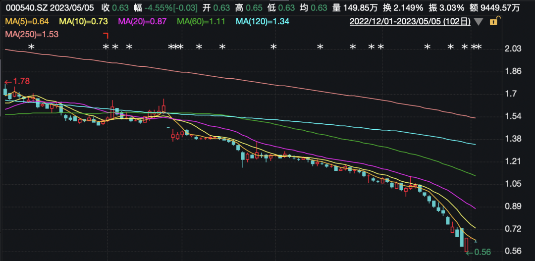 5月5日开盘,*ST中天股价早盘期间出现短暂拉升,但随后快速下跌,封死跌停板。截至当天收盘,报0.63元/股,总市值跌至44.13亿元。值得注意的是,自4月17日以来,公司收盘价已连续11个交易日低于1元。据记者测算,即便接下来的9个交易日公司股价连续涨停,也无法在第20个交易日站上1元,由此也提前锁定了“1元退市”。