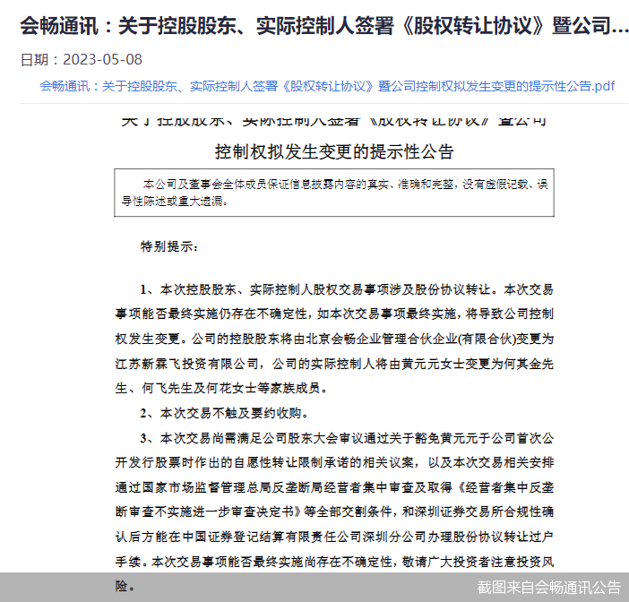 5月7日晚间,会畅通讯一纸公告宣布公司控制权将发生变更。