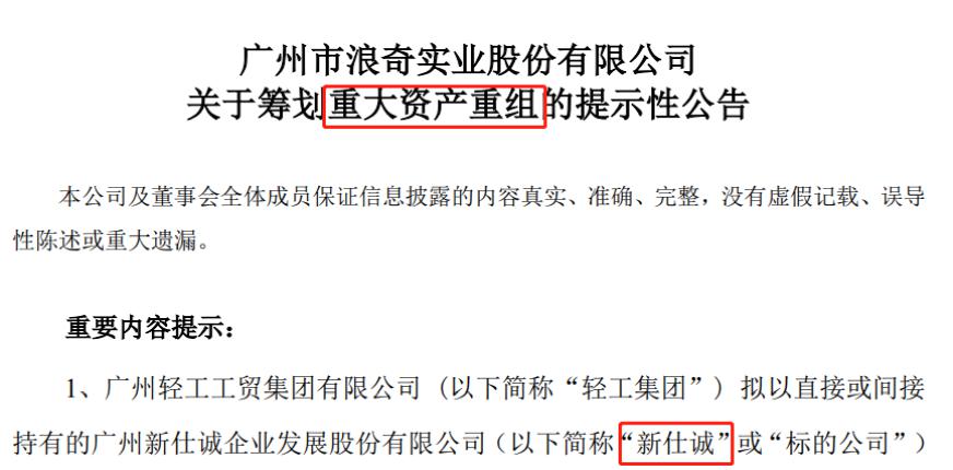 5月12日晚,广州浪奇(000523)公告,公司正在筹划与控股股东广州轻工集团进行重大资产置换。轻工集团拟以持有的新仕诚不低于51%股份,与公司所持有的南沙浪奇等四家子公司股权进行置换,差额部分以现金补足。交易完成后,广州浪奇将不再经营日化业务,新增新仕诚经营的的文化创意产业园区开发和运营业务,同时继续保留2018年新增的制糖和饮料业务。